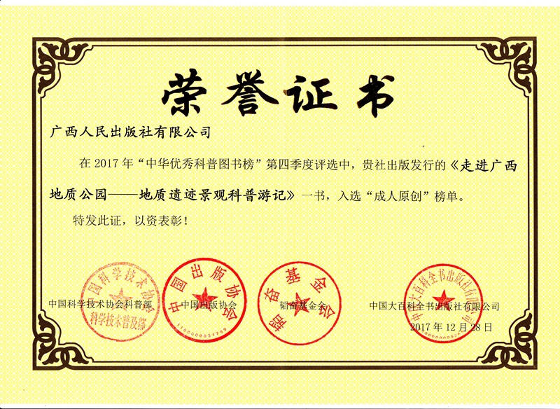 《走进广西地质公园——地质遗迹景观科普游记》2017年“中华优秀科普图书榜”第四季度“成人原创”榜单