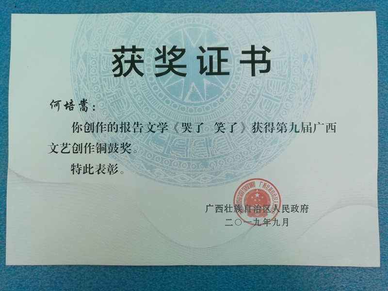 《哭了 笑了》第九届广西文艺创作铜鼓奖证书