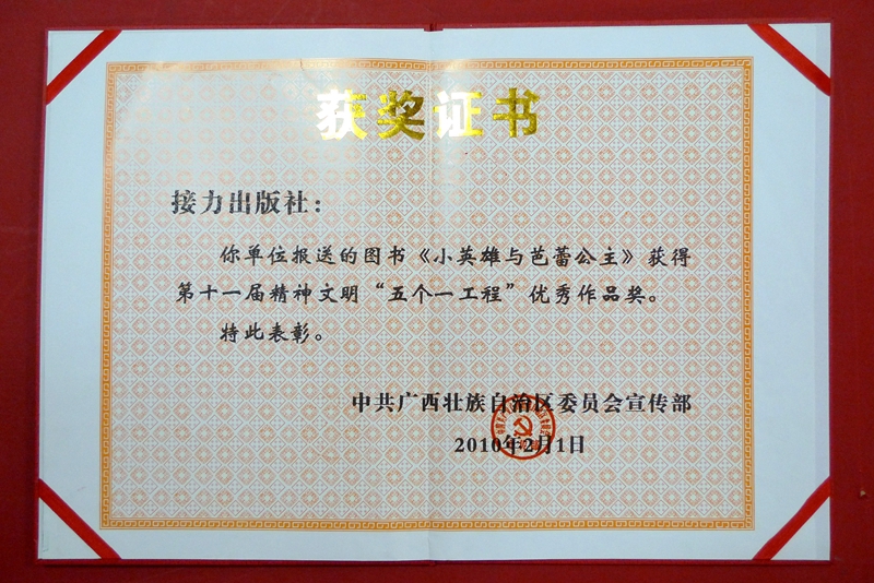 2010-“五个一工程”优秀作品奖《小英雄和芭蕾公主》-只有自治区宣传部颁发证书